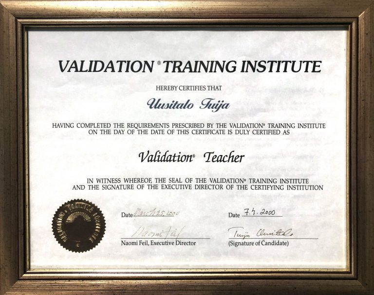 Olen saanut tehdä yhteistyötä omaisten kanssa ja olen ollut esimiehenä hoitohenkilökunnalle. Olen huomannut 20 vuoden käytännön kokemuksen aikana miten validaatiomenetelmä on auttanut muistisairaita ihmisiä, heidän läheisiään ja hoivayhteisöjä. Olen täysin vakuuttunut sen hyödyistä.